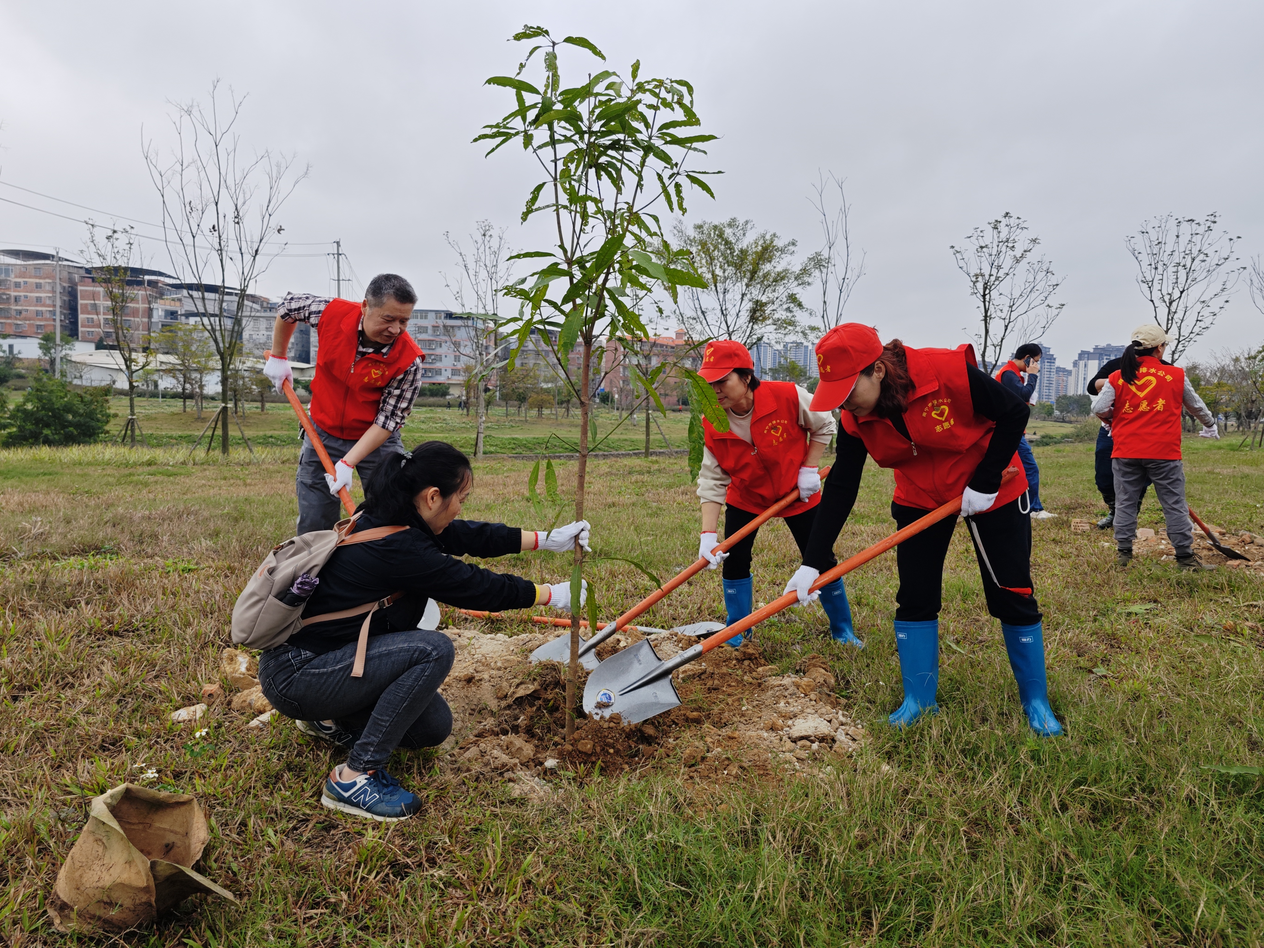 活動現(xiàn)場,綠化養(yǎng)護(hù)人員向大家講解種植樹苗的注意事項和技巧,志愿者們圍攏聆聽,記錄關(guān)鍵步驟。學(xué)習(xí)結(jié)束后,志愿者們迅速分組,領(lǐng)取樹苗、鐵鍬、水桶等工具,開啟“實戰(zhàn)”模式。大家分工明確,有的扶苗培土,有的提水澆灌,配合默契,現(xiàn)場一片熱火朝天景象。新栽的樹苗錯落有致、迎風(fēng)挺立,為初春的朝陽溪增添勃勃生機。