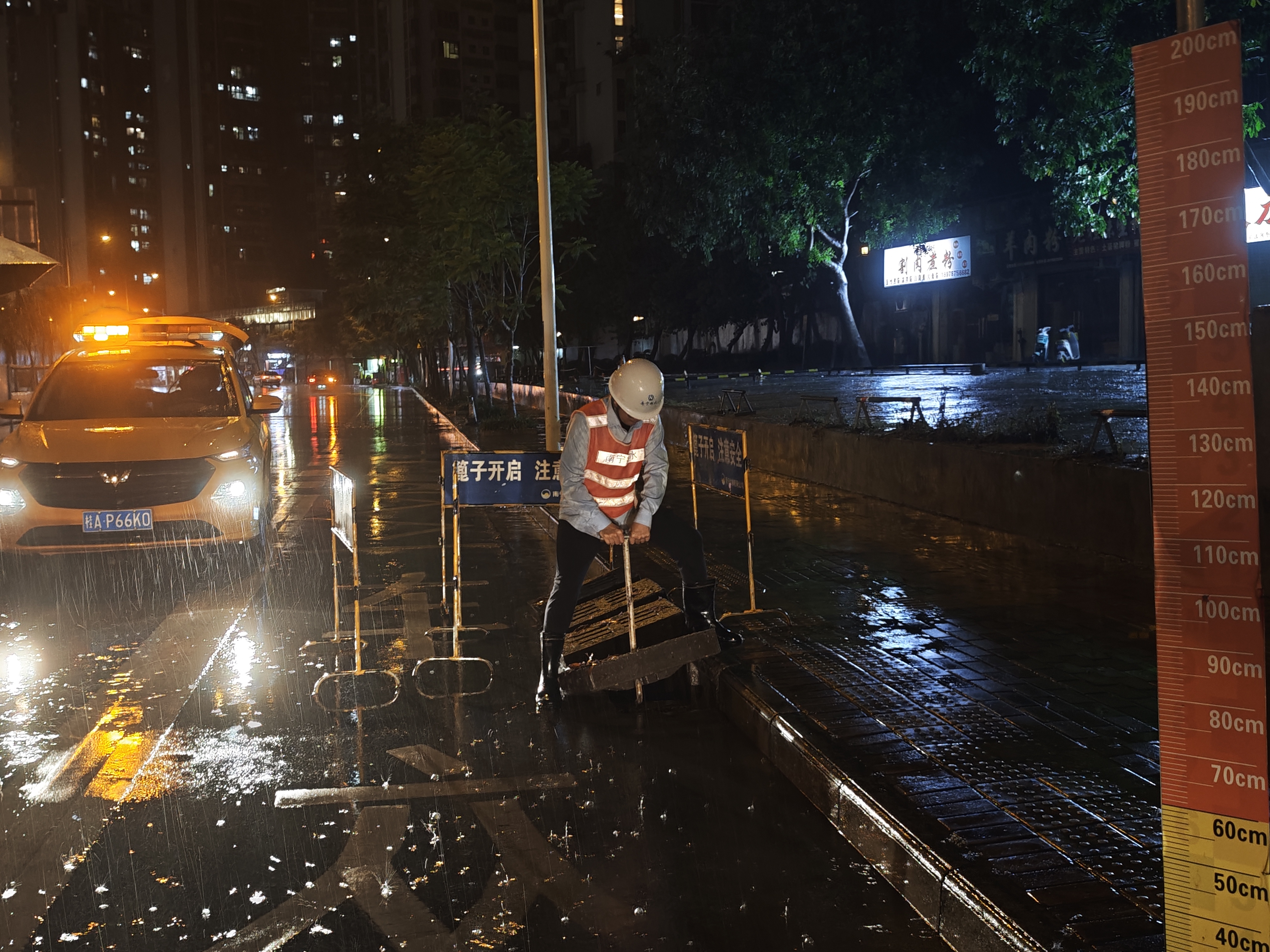 5月27日19時,市排水公司運維管理員梁煜華到達大淥嶺路口,擺放警示標識、設置安全隔離帶、打開雨水箅子和井蓋,一套動作行云流水。在確認該處排水順暢后,他跟值守的工作人員打了聲招呼,又匆匆趕往鳳嶺北路楓林路口,查看積水處置情況,引導過往車輛有序通行。