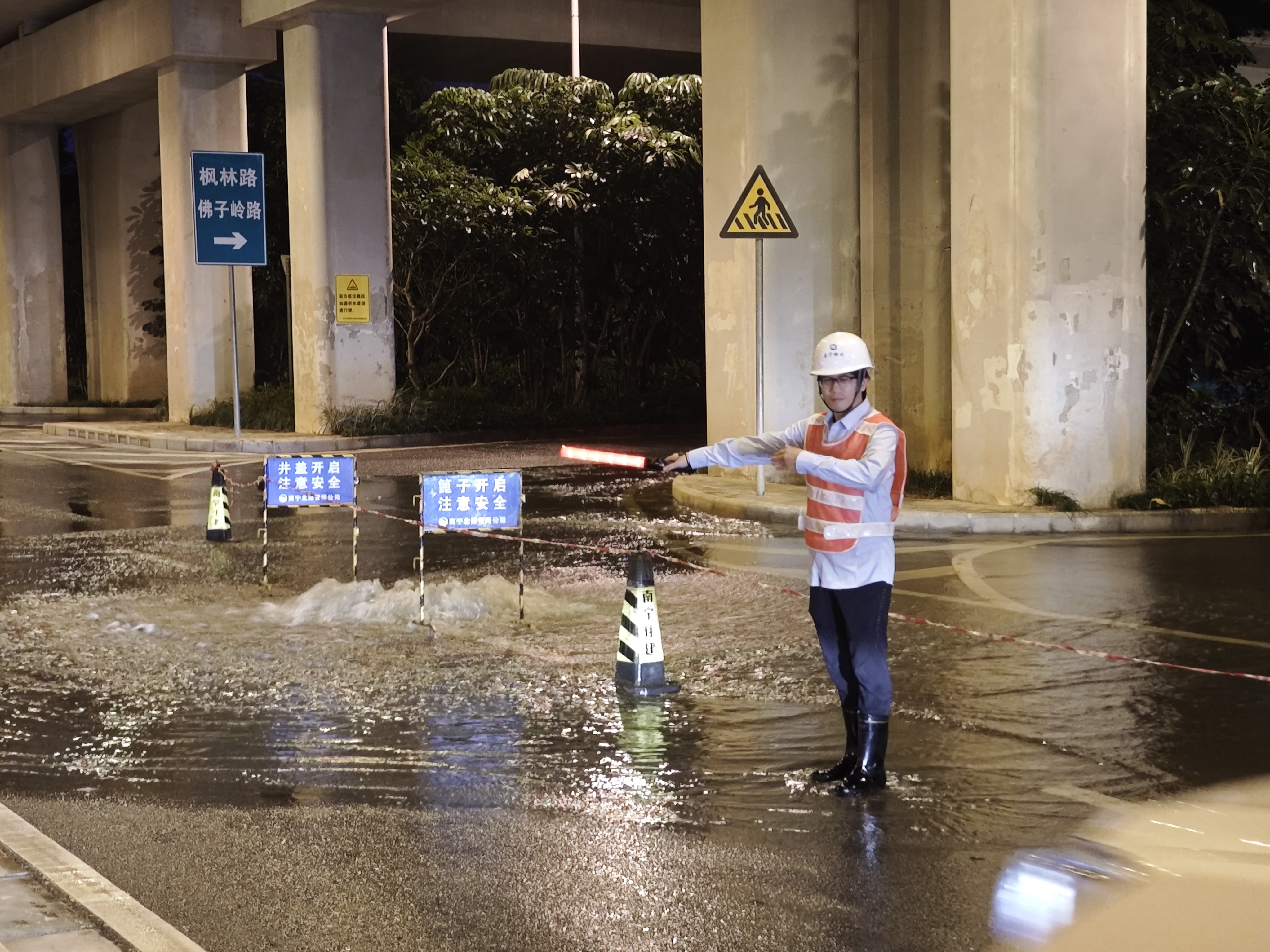 市排水公司工作人員在鳳嶺北路楓林路口引導車輛有序通行